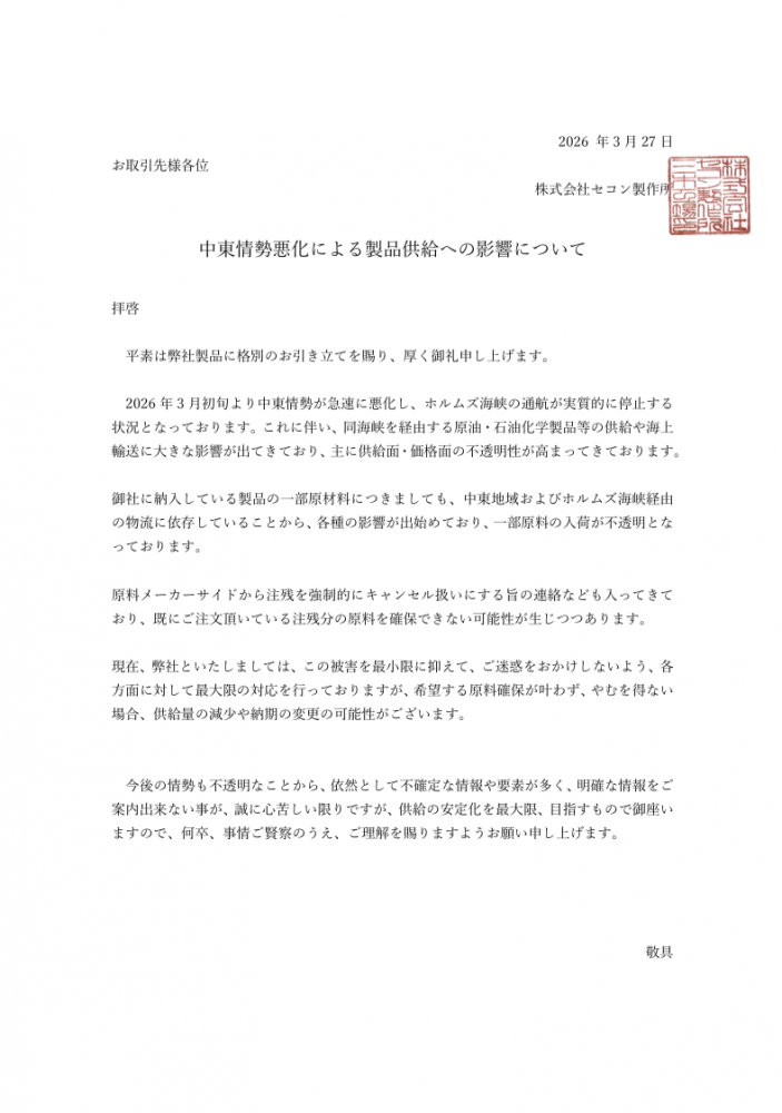 2026年03月27日 中東情勢悪化による供給面の影響についてのご案内 (PDFファイル:539.7KB) PDFファイルをご覧いただくためには Adobe Reader(アドビ・リーダー)が必要です。